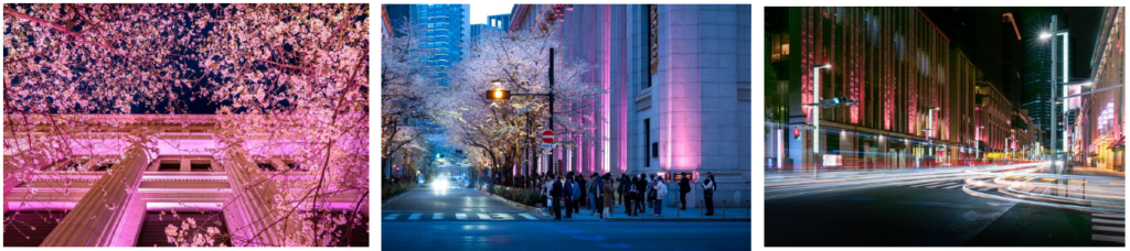 場所は、中央通り沿いに立ち並ぶ重要文化財や日本橋屈指の桜の名所「江戸桜通り」など(OVOL日本橋ビル、COREDO室町1・3、日本橋三井タワー、三井本館、日本橋三越本店 本館)。