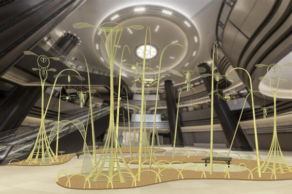 1F アトリウムには、松本秋則(作家)による竹のサウンド・インスタレーションで、竹林を歩くように心身をととのえる空間が展開。